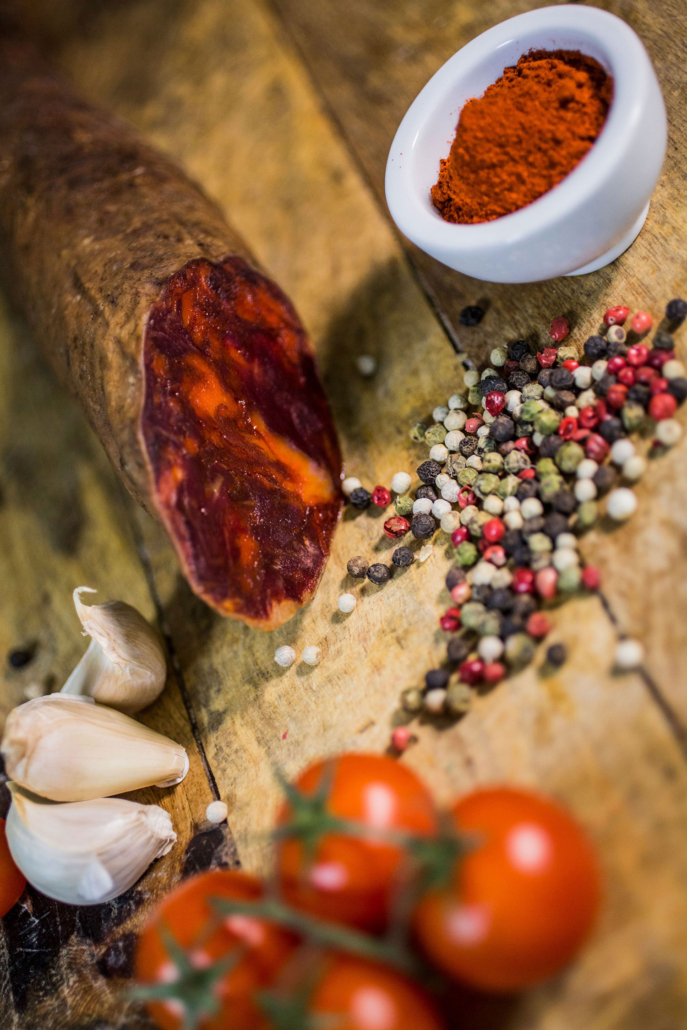 El chorizo de bellota ibérico es un producto elaborado a partir de las partes magras y las piezas nobles, seleccionadas exclusivamente para la elaboración de este chorizo. El secreto de su calidad está en la carne, que luego se condimenta, dándole su toque final de sabor con pimentón y especias según la receta tradicional. Este chorizo proviene de un cerdo ibérico alimentado con bellota durante la montanera. Se trata de un chorizo intenso con un sabor lleno de matices. Tiene un periodo de curación de 6 meses en bodegas naturales.
